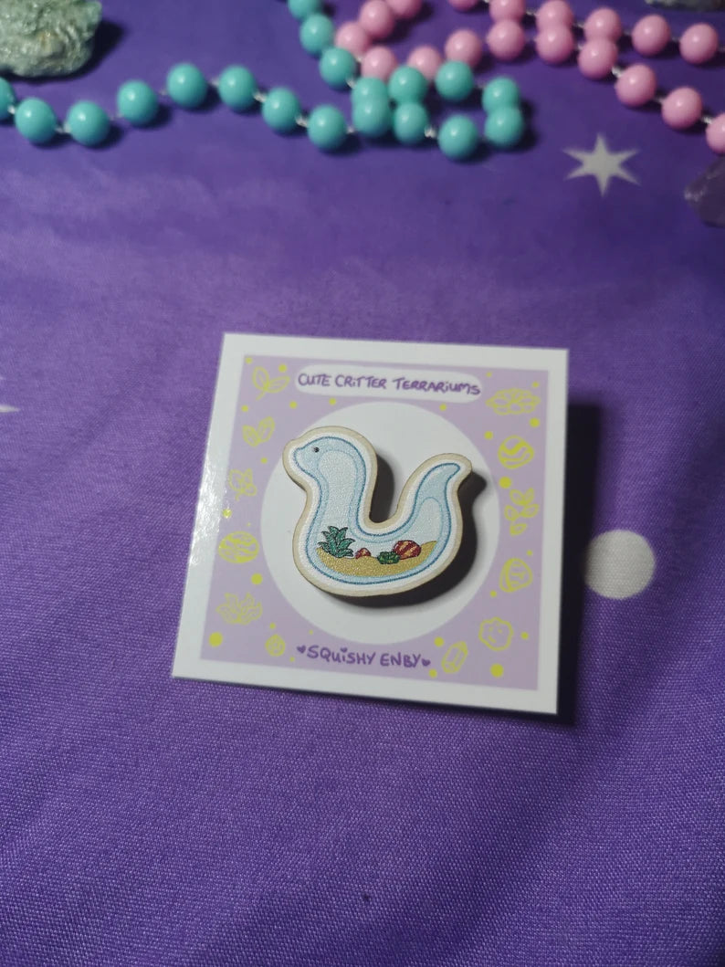 These adorable little hognose snake wooden pins are filled with succulent plants and red jasper. They'd love to slither home to you and keep you company, or maybe be gifted to a friend to take care of them. They have 2 pin posts at the back of them and 2 rubber clutches to keep them secure. Each pin is 1 inch wide.